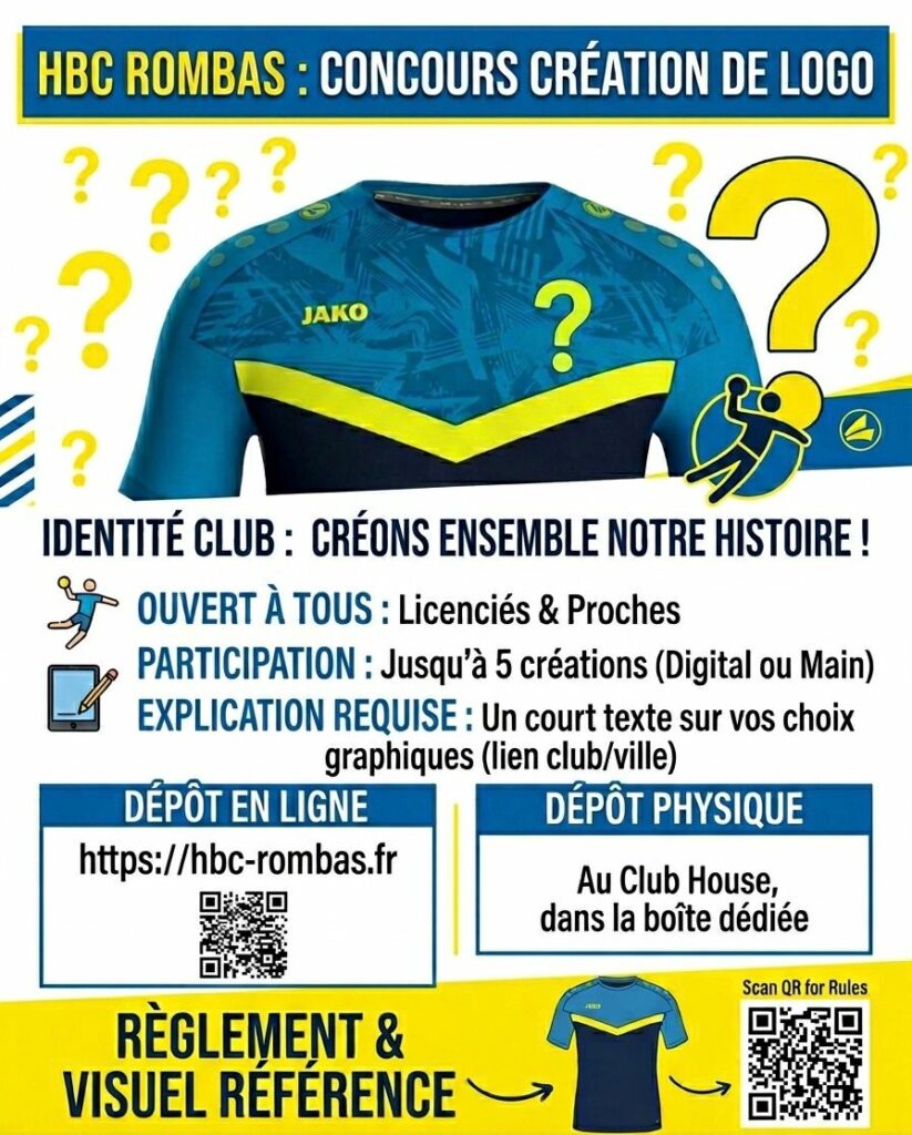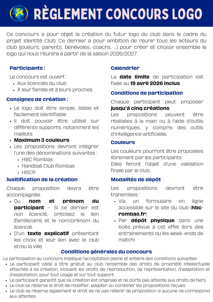 Ce concours est ouvert à l’ensemble des licenciés, ainsi qu’à leurs proches. L’objectif est de construire une identité forte et représentative du club, qui sera utilisée sur l’ensemble des supports (maillots, communication, événements).